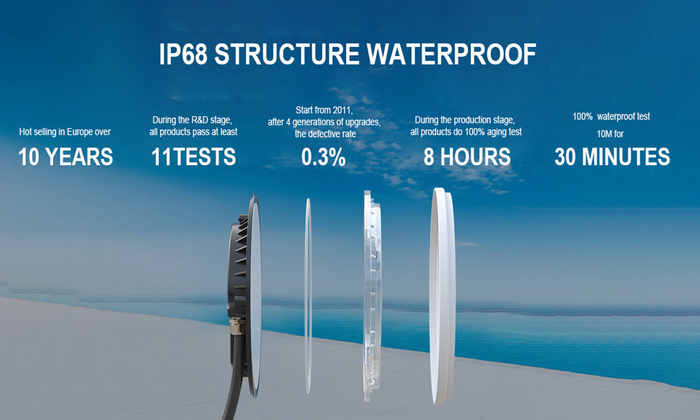 5. IP68 vandeniui atspari konstrukcija, skirta visiškam panardinimui ir atsparumui baseino chemikalams.